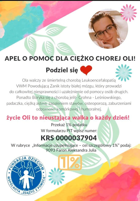 Aukcje charytatywne dla ciężko chorej Oli. Kupując tutaj pomagasz ratować zdrowie i życie Oli. Możesz też wpłacić darowiznę lub rozliczyć się z 1,5 %Z PODATKU Więcej na temat Oli na stronie fundacji w linku poniżej